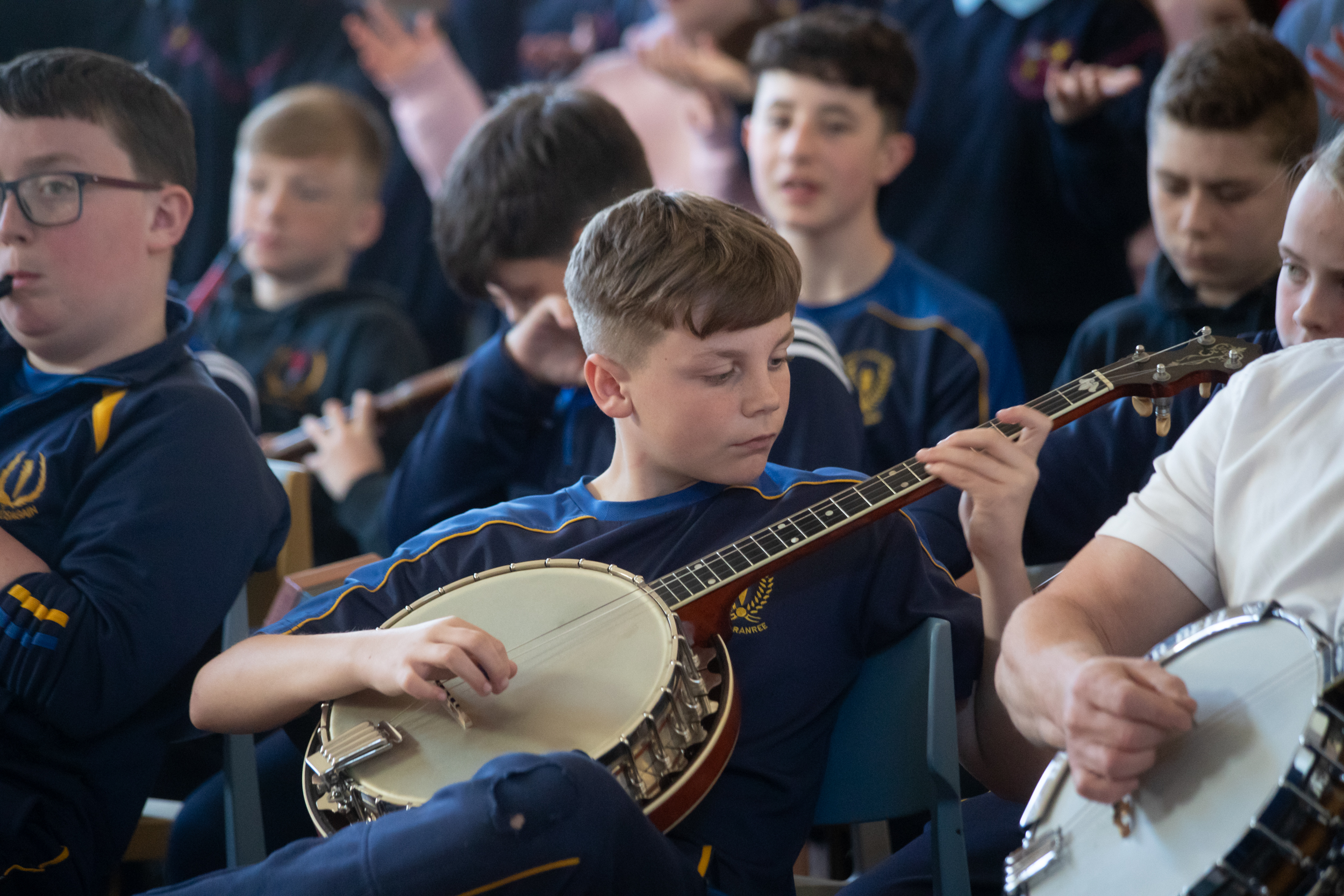 Young musicians from Scoil Iosagáin Farranree rehearsing for Féile Fearann Rí with John Spillane. Photo by Fionn Mulvey