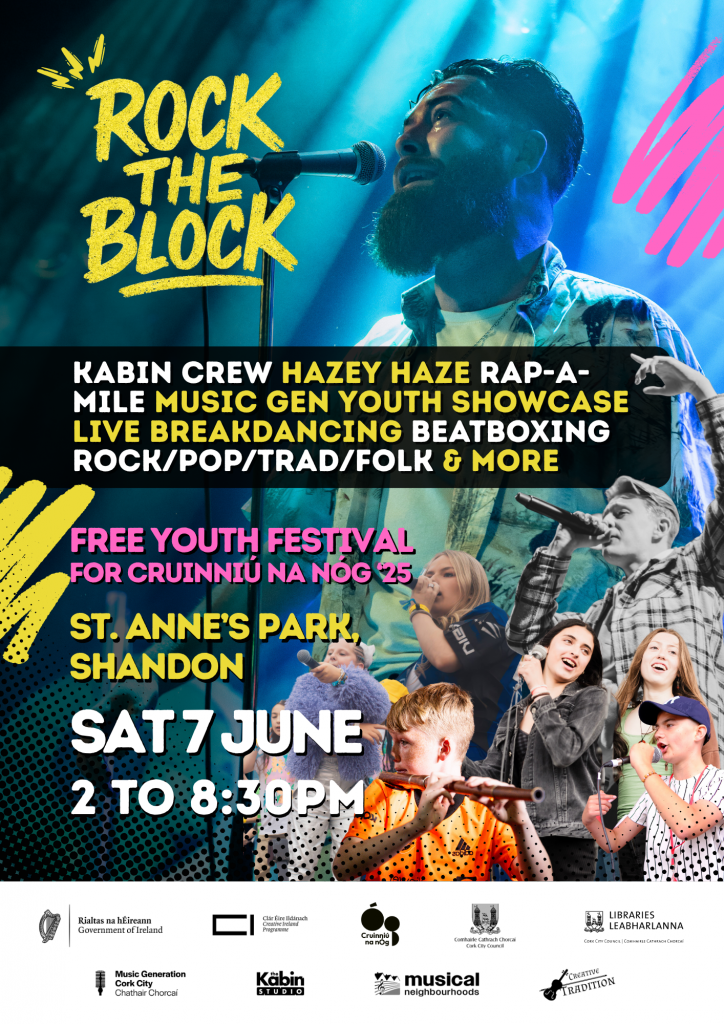 A collision of genres, an explosion of sounds and a meeting of minds, Rock the Block 2025 takes up residence in St. Anne’s Park Shandon to celebrate Cruinniú na nÓg 2025! This event will showcase a myriad of young music-makers, plus a very special performance from headline act Hazey Haze, who has been storming his way through the rap and hip-hop world!