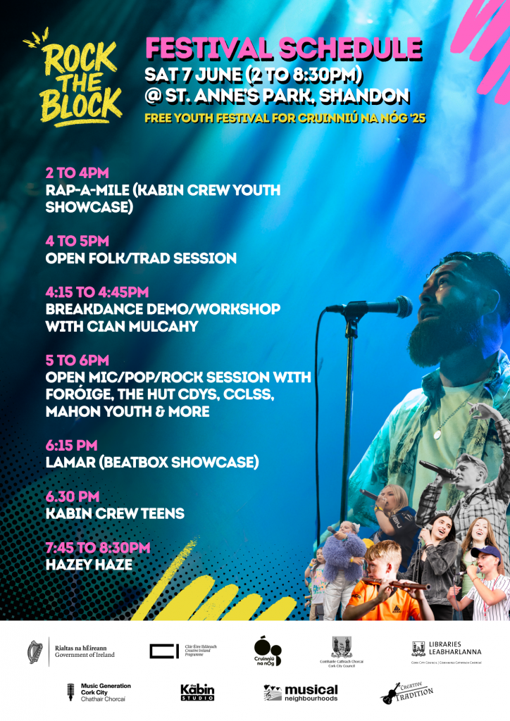 Opening with Rap-A-Mile from the youngest performers of the Kabin Studio (think ‘The Spark’ fame) from 2pm, followed by a traditional Irish and folk open jam session at 4pm; an interactive breakdance workshop with Cian Mulcahy at 4.15pm; a rock, pop, rap and hip-hop open mic session from 5pm; a beat-box showcase with LAMAR at 6.15pm; a music showcase by the Kabin Crew Teens at 6.30pm; and culminating in a not-to-be-missed guest performance by the trailblazing Hazey Haze at 7.45pm to close out Rock the Block 2025.
